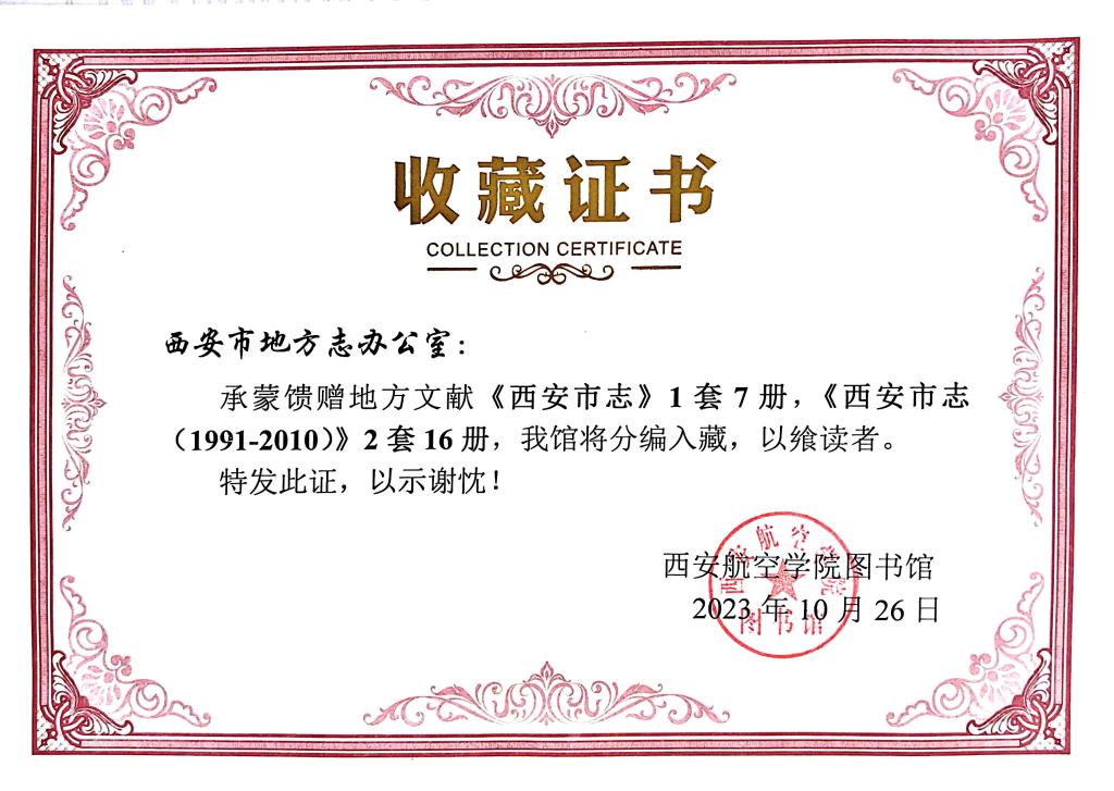 近日,西安市地方志办公室向beat365图书馆捐赠《西安市志》《西安市志(1991-2010)》等史志书籍23册,图书馆接受赠书并向西安市地方志办公室颁发收藏证书。