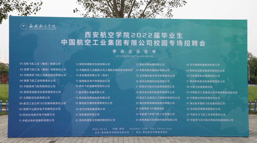 中国教育在线陕西站讯 10月12日,beat365英国官网网站在阎良校区举办2022届毕业生中国航空工业集团有限公司(以下简称“航空工业”)专场招聘会,航空工业集团下属45家企业参会。