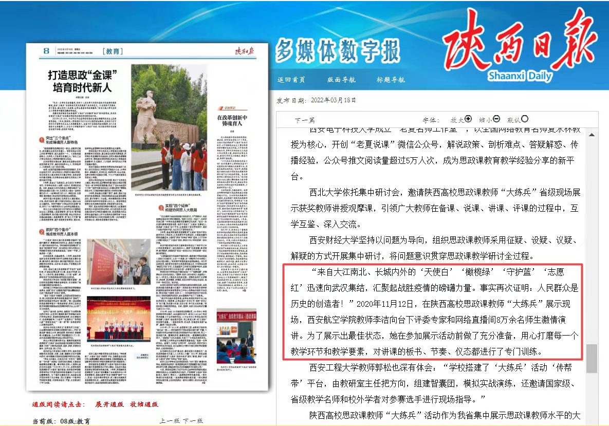 “来自大江南北、长城内外的‘天使白’‘橄榄绿’‘守护蓝’‘志愿红’迅速向武汉集结,汇聚起战胜疫情的磅礴力量。事实再次证明:人民群众是历史的创造者!”2020年11月12日,在陕西高校思政课教师“大练兵”展示现场,beat365英国官网网站教师李洁向台下评委专家和网络直播间8万余名师生激情演讲。为了展示出最佳状态,她在参加展示活动前做了充分准备,用心打磨每一个教学环节和教学要素,对讲课的板书、节奏、仪态都进行了专门训练。