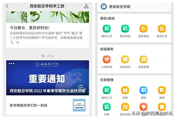 学生教育管理。建立学生信息台账,明确辅导员、班主任实时掌握学生身体健康状况,严格落实晨午检制度。利用官微、网站等平台加强疫情防控宣传教育工作,提高学生疫情防控意识和能力。对受疫情影响的学生发放有关生活物资,生活补贴和临时特殊困难补助,并通过线上开展心理辅导。发布《2022年春季学期学生返校须知》,向学生详细解读开学准备、报到和返校后的各项要求,全流程、全方位地解疑答惑。组织筹备两校区学生返校工作演练,落实落细相关工作流程和职责安排。