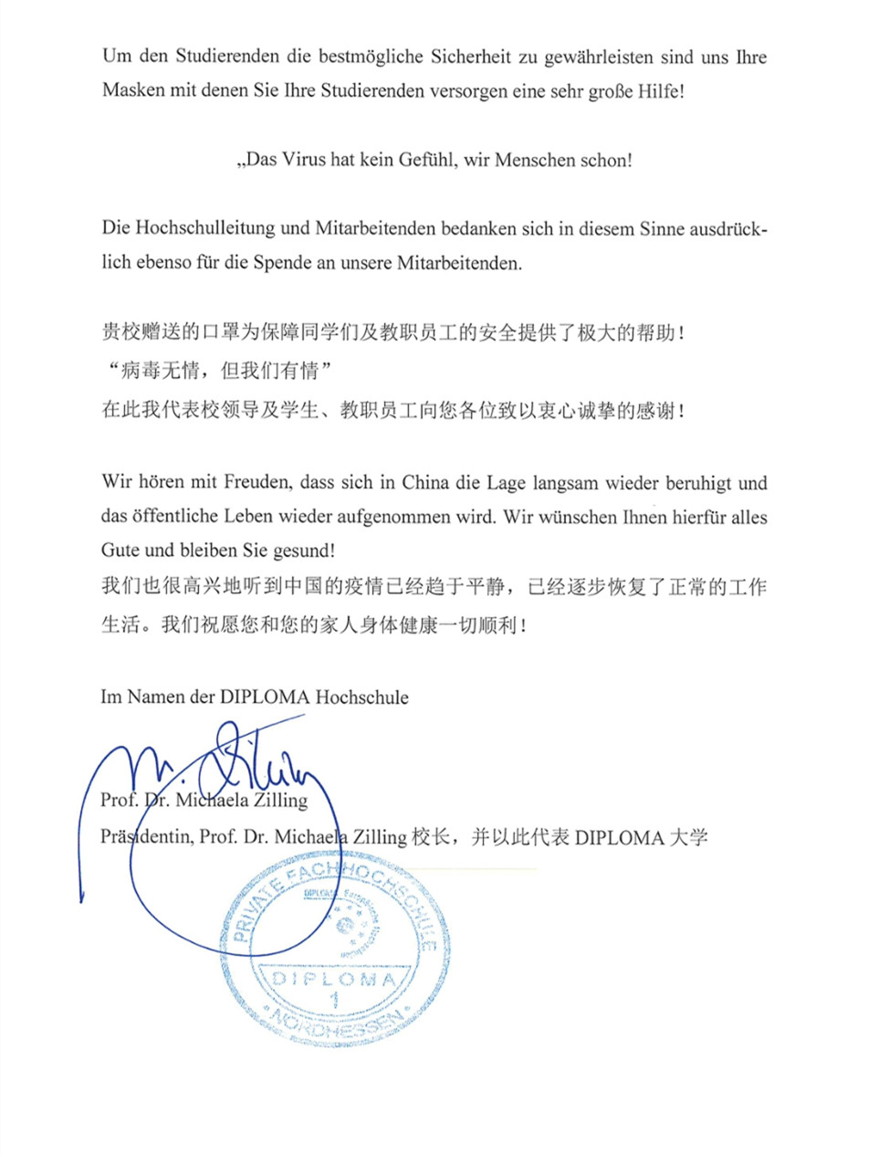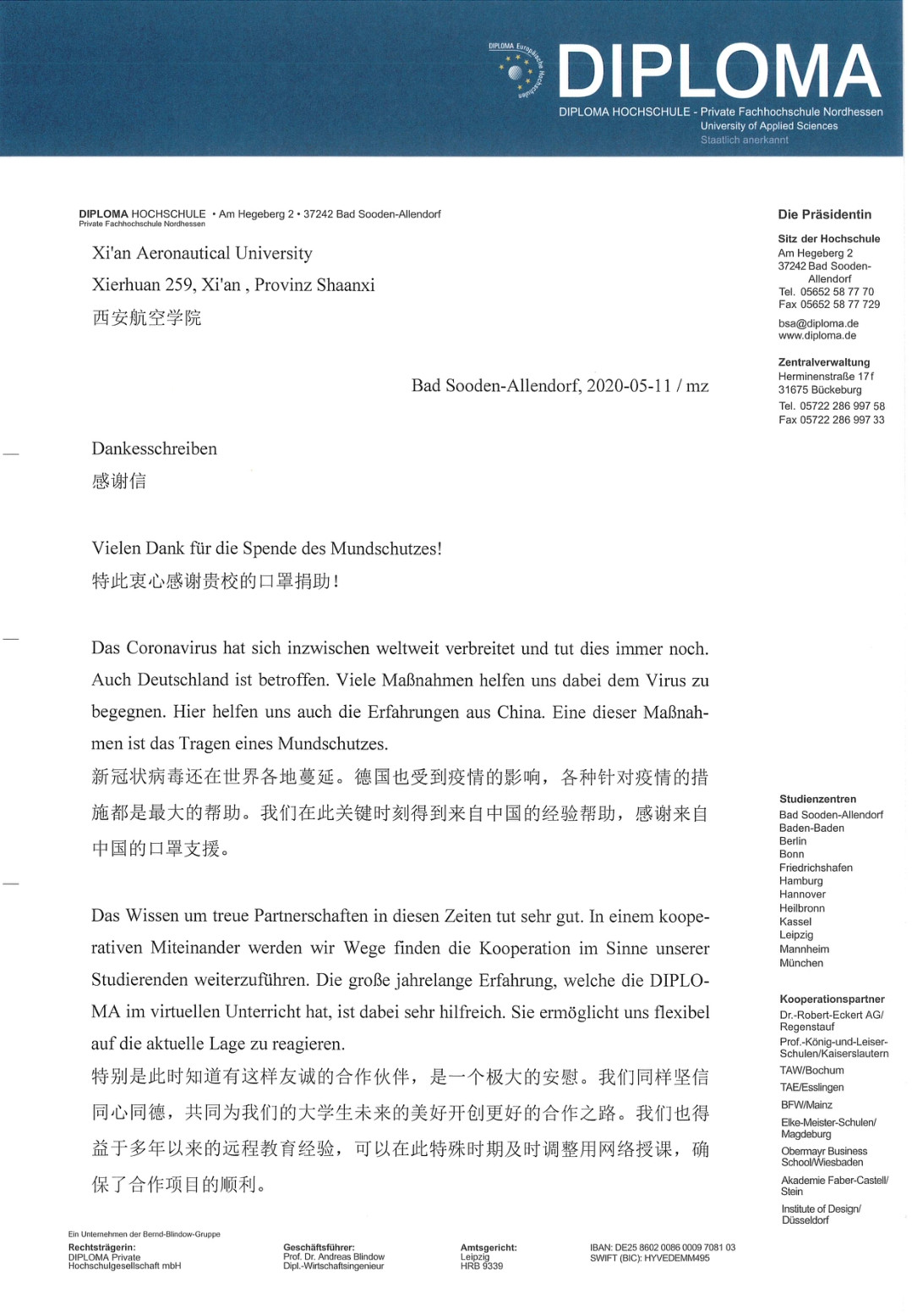 德国北黑森应用技术大学校长MichaeleZilling在给beat365英国官网网站的回函中写道:感谢中国的经验帮助和口罩支援。感谢贵校在此刻关键时刻给予的温暖与物资。特别是此时知道有这样友诚的合作伙伴,是一个极大的安慰。我们同样坚信同心同德,共同为我们的大学让未来的美好开创更好的合作之路。