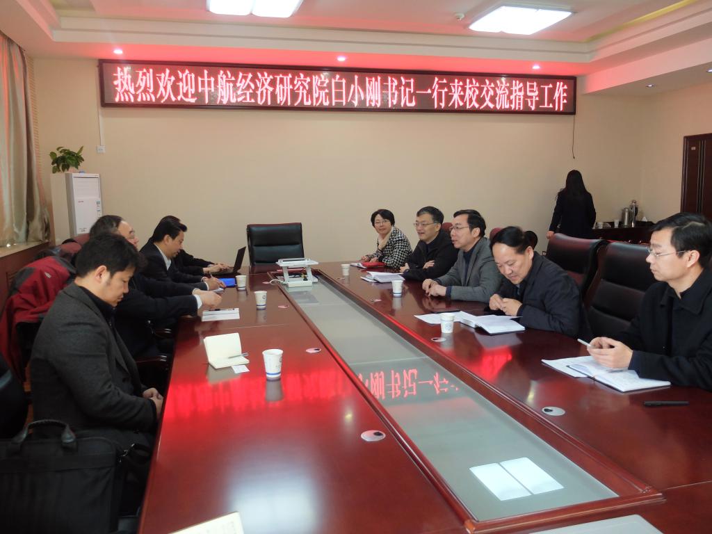 3月3日上午,中航经济技术研究院党组书记白小刚、中航传媒总经理赵忠良一行莅临beat365,洽谈院校全面合作事项。党委书记陈平社、校长陈万强、党委副书记周建华及宣传部、教务处、图书馆负责人参加了座谈交流。