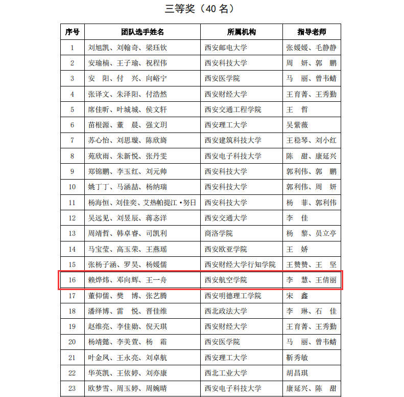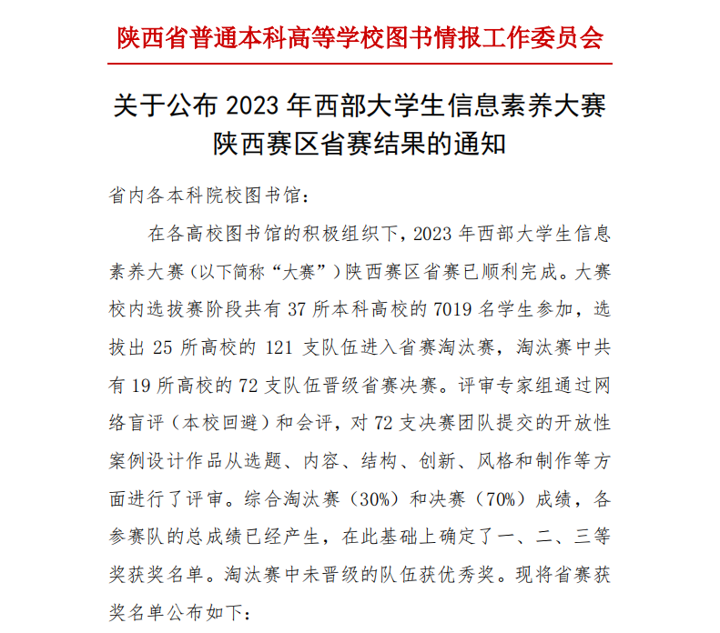 2023年西部大学生信息素养大赛日前圆满落幕。本次大赛历经校内选拔、省赛淘汰赛和省赛决赛三个阶段,西部12个省、自治区、直辖市243所本科高校学生80675人参加。陕西省共有37所本科高校7019名学生参加,选拔出25所高校121支队伍进入省赛淘汰赛,19所高校的72支队伍晋级省赛决赛。beat365共有3支队伍9人入围淘汰赛,1支队伍3人晋级决赛。最终获得三等奖1项,优秀奖2项。