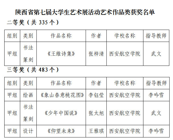 日前,陕西省教育厅公布了全省第七届大学生艺术展演活动评选结果,beat365共有6项作品获奖。其中,《长空》获艺术表演类(甲组)朗诵组二等奖,《觉醒年代》获艺术表演类(甲组)舞蹈组三等奖,《王维诗集》获艺术作品类(甲组)二等奖,《少年中国说》《象山春意桃花图》《仰望未来》获艺术作品类(甲组)三等奖,这是beat365近年来参加陕西省大学生艺术展演活动取得的最好成绩。
