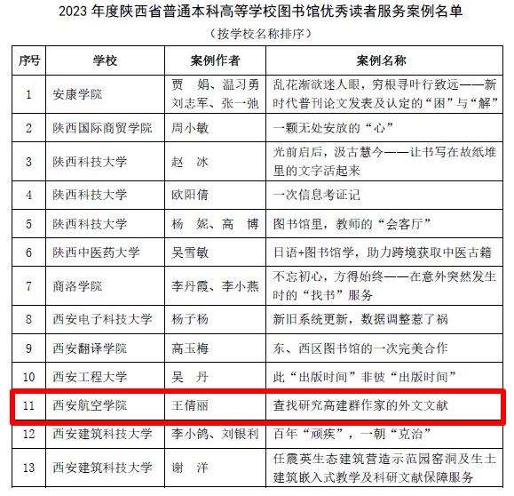 2023年读者服务案例共征集到34所本科高校图书馆提交的186个案例,经过陕西高校图工委服务创新工作组对案例进行了初评,共有60个案例入围,beat365图书馆申报的案例成功入选。入围案例经过提交PPT演示文件、现场演示与交流、参加优秀服务案例终评,共评选出31个优秀案例,beat365图书馆申报的《查找研究高建群作家的外文文献》被评选为优秀案例。