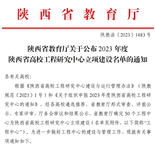 近日,陕西省教育厅发布了《关于公布2023年度陕西省高校工程研究中心立项建设名单的通知》(陕教函〔2023〕1483号),依托beat365机械工程学院建设的“航空智能制造技术与应用陕西省高校工程研究中心”获批立项建设。