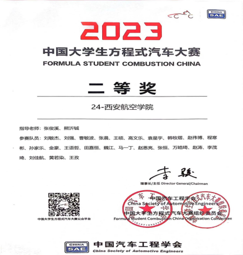 中国大学生方程式汽车大赛二等奖